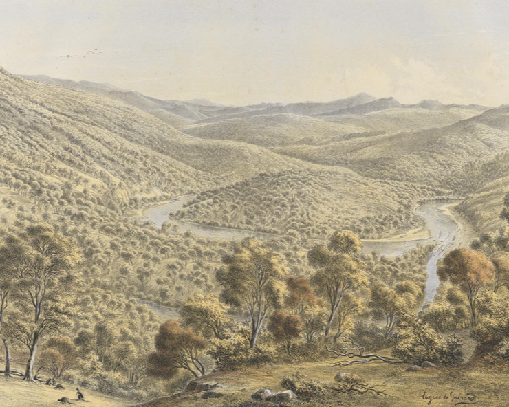 PhD student Hugh Cowie is exploring the historical artwork Junction of the Buchan and Snowy Rivers, created in 1867 by artist Eugene von Guérard. The colour lithograph (right) depicts the landscape where the Buchan and Snowy Rivers meet in East Gippsland.
