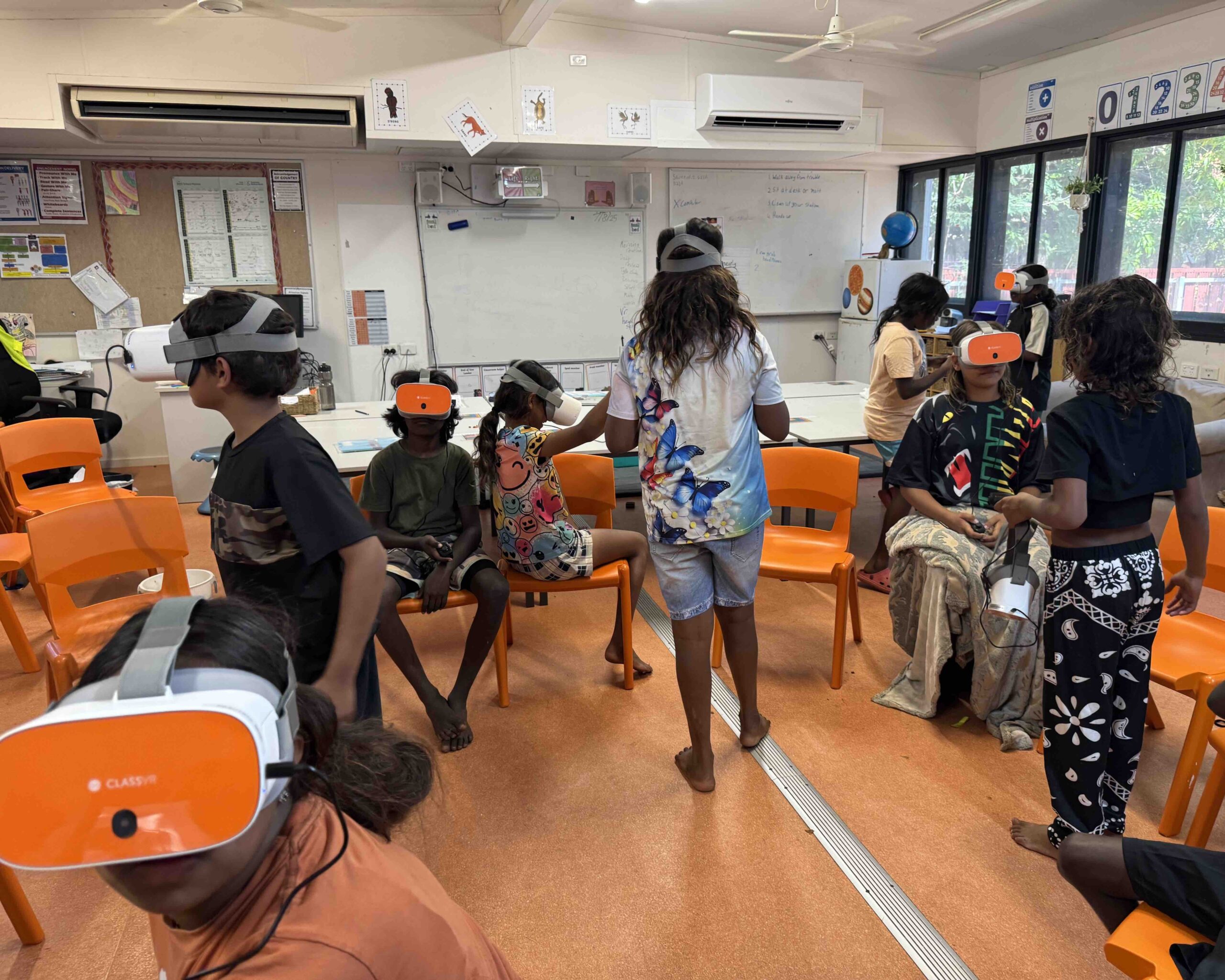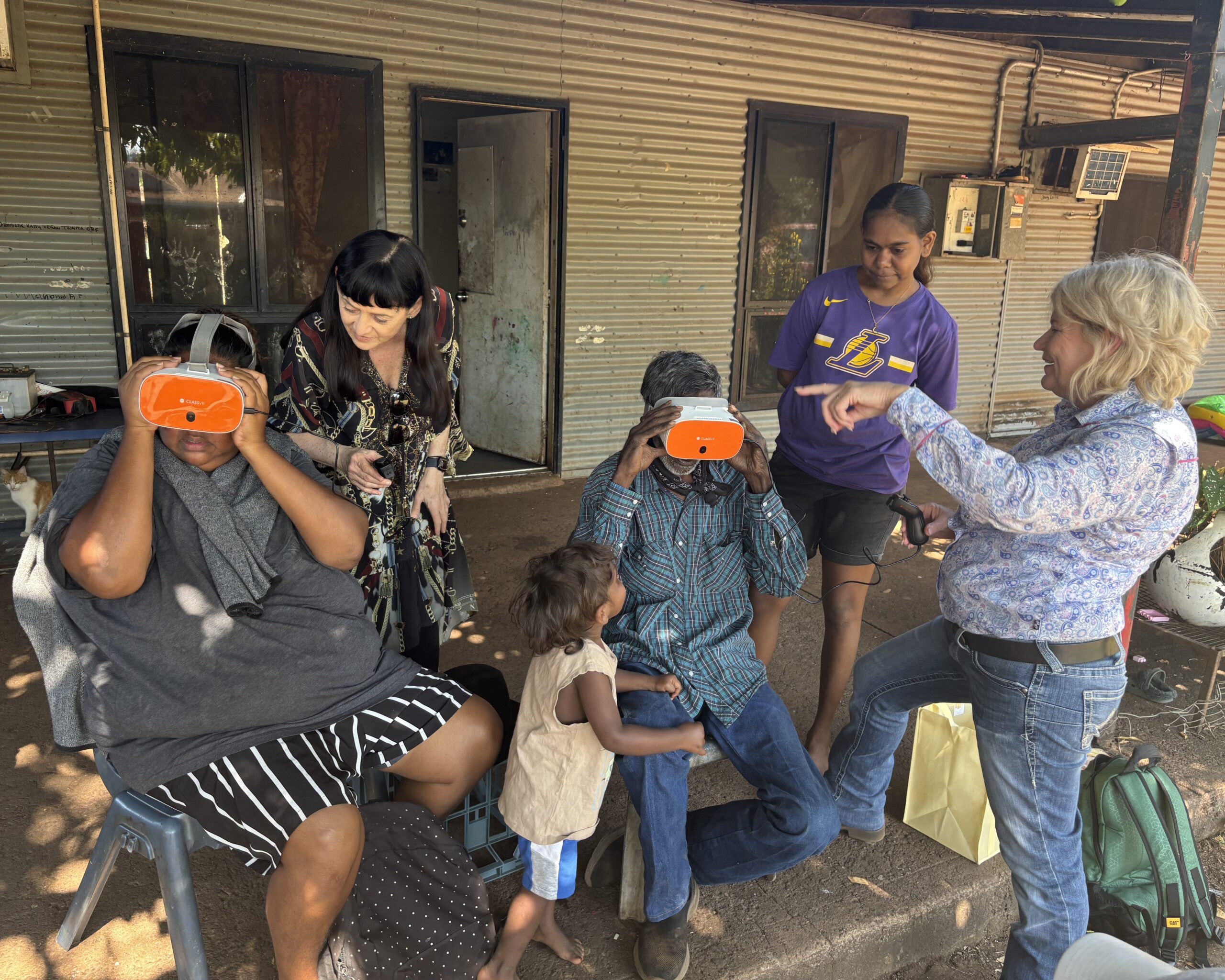 The ‘VR team’ visited the remote Barking Owl camp site in July 2022, camping alongside the Drysdale River. There, they captured thousands of ultra-high-resolution photographs using cameras and drones, which have since been turned into 3-dimensional computer models that faithfully capture the rock shape to sub-cm accuracy, and the art panel paintings and other surface features to sub-mm accuracy and high colour accuracy. The 3-D models can be viewed on computer screens, projectors, and most importantly for this project, Virtual Reality (VR) headsets.